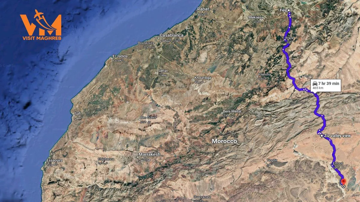 The road from Fes to Merzouga is often called the “Route of Contrast.” In a single day, you will witness the landscape transform from European-style alpine villages to the arid, red-earth majesty of the pre-Sahara. This 4 days desert tour from Fes to Merzouga covers approximately 1,000 kilometers (round trip).